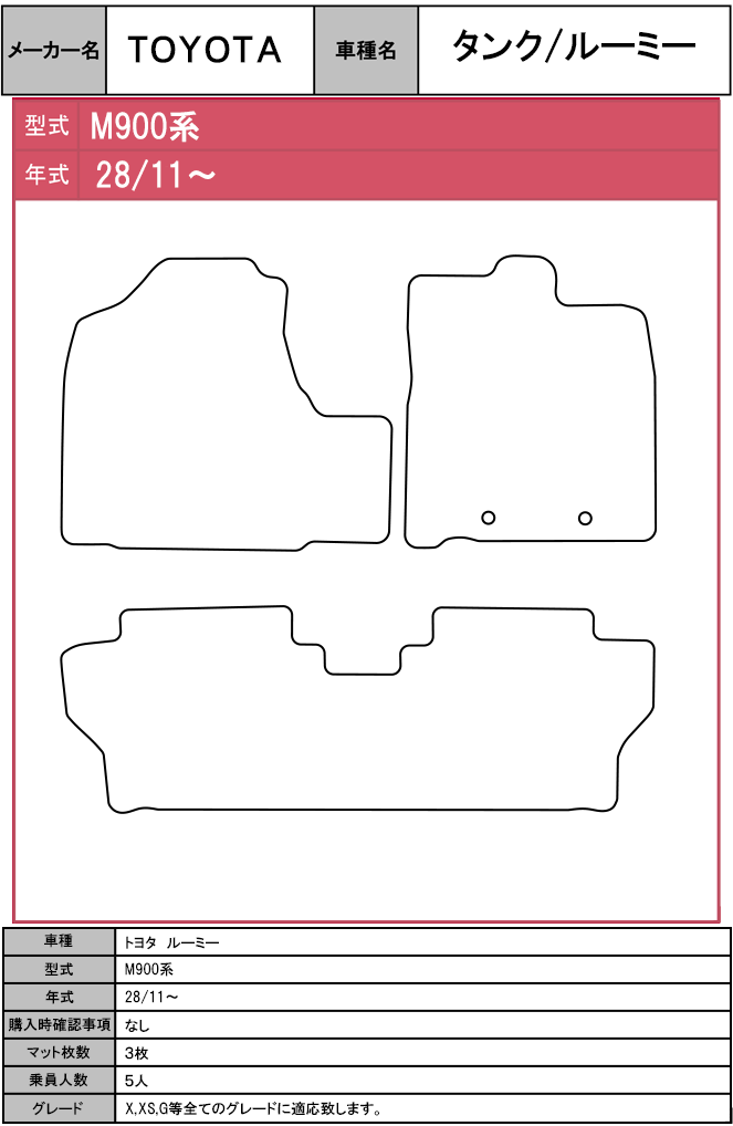 商品名 トヨタ ルーミー/タンク M900系 H28/11〜 用オリジナルマット※寒冷地仕様車対応 ※フロントシートウォークスルー部分のマットは付属していません。
